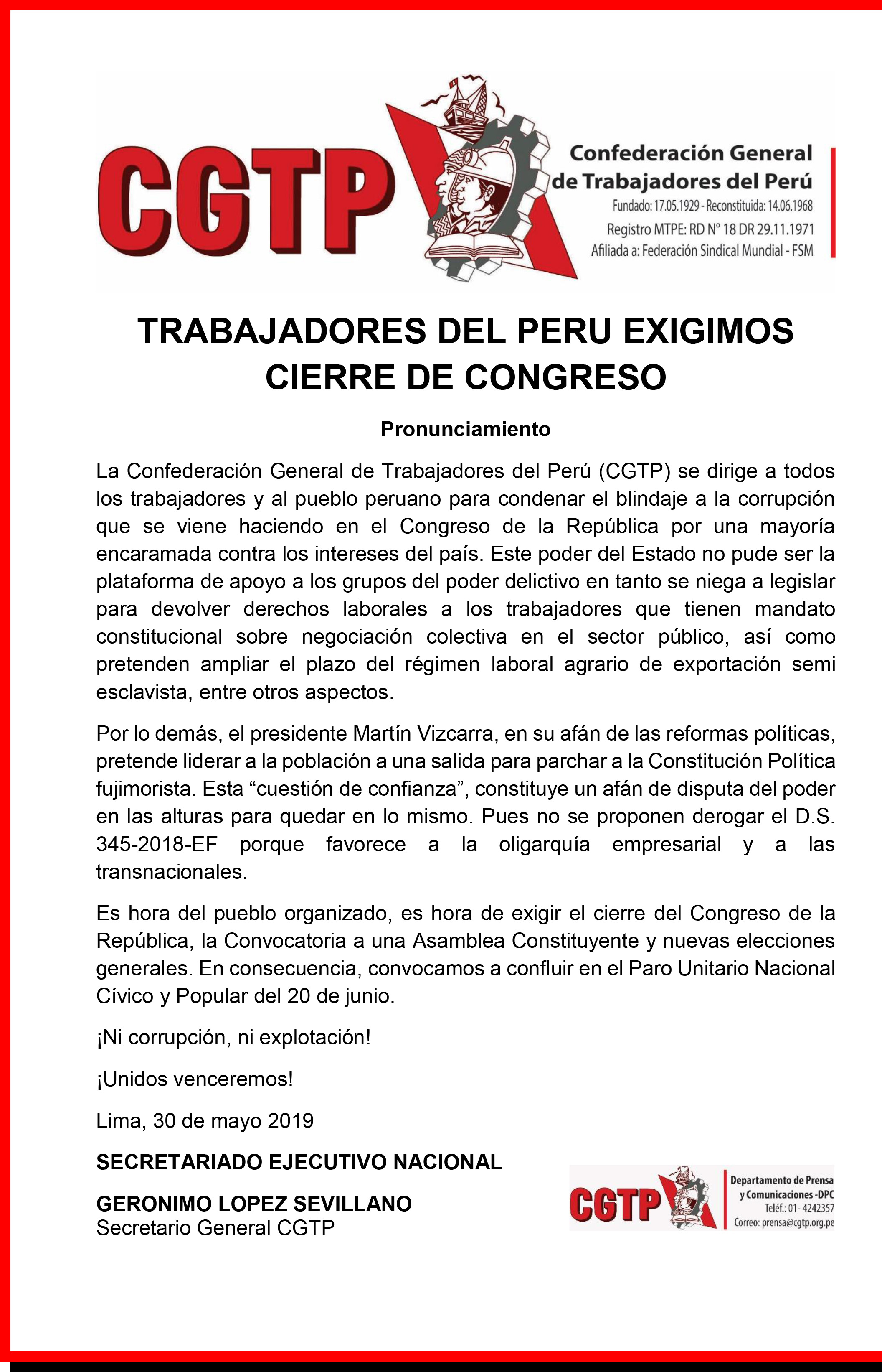 Finalmente la CGTP hace un llamado a «exigir el cierre del Congreso de la República, la Convocatoria a una Asamblea Constituyente y nuevas elecciones generales. En consecuencia, convocamos a confluir en el Paro Unitario Nacional Cívico y Popular del 20 de junio».